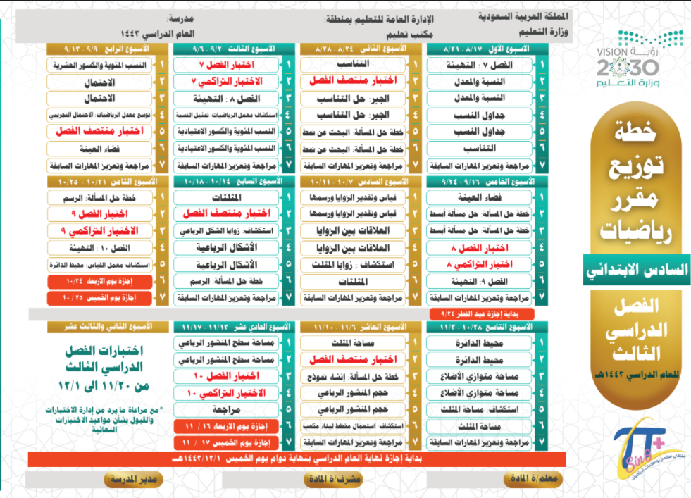 ننشر لكم اليوم توزيع مادة الرياضيات الصف السادس الابتدائي الفصل الدراسي الثالث 1445 ف3 بصيغة PDF