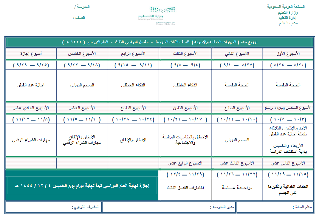 ننشر لكم اليوم توزيع مادة المهارات الحياتية والاسرية لطلاب الصف الثالث المتوسط 1445 هـ ، وذلك للفصل الدراسي الثالث ويستطيع المعلم او المعلمة التعديل علي الخطة بما يتناسب مع الخطة الدراسية